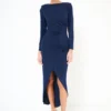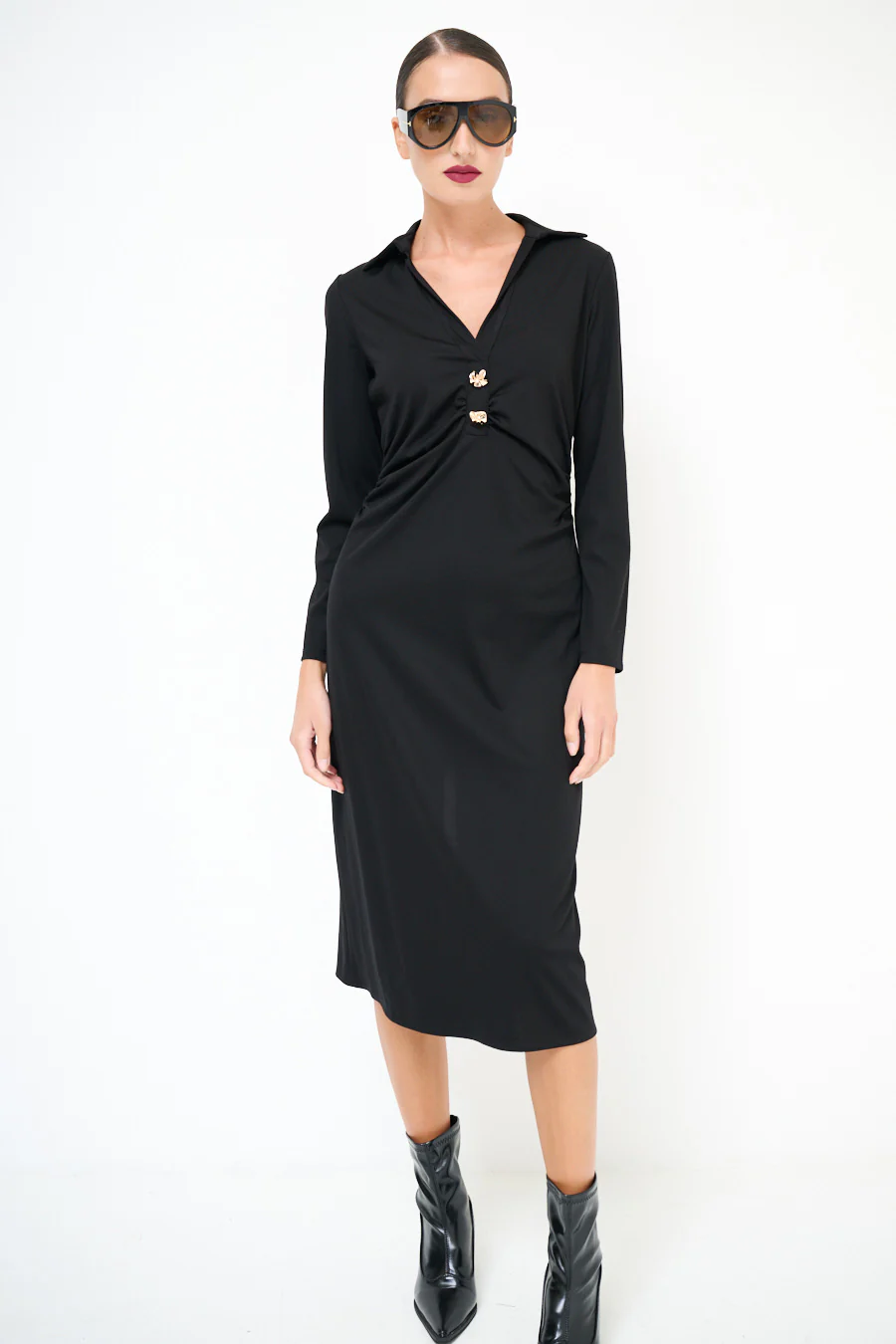 Elegant collared long sleeve midi dress with gold button