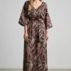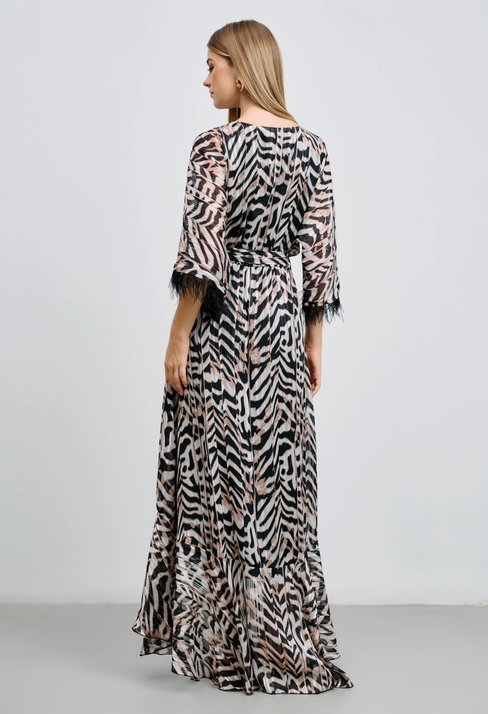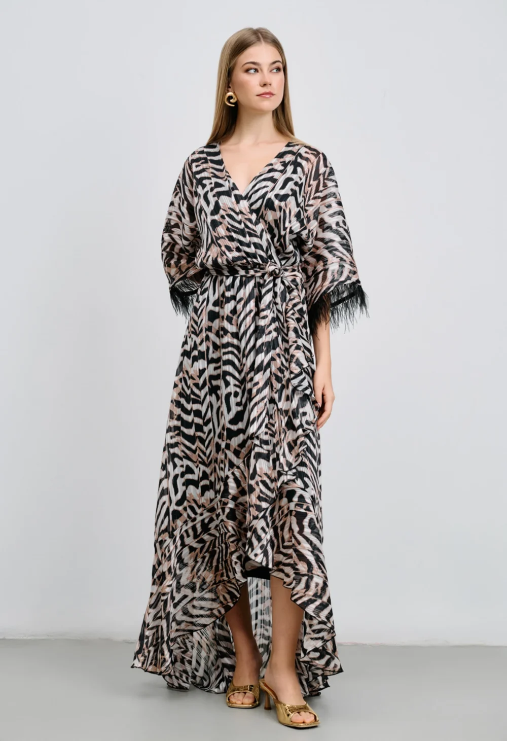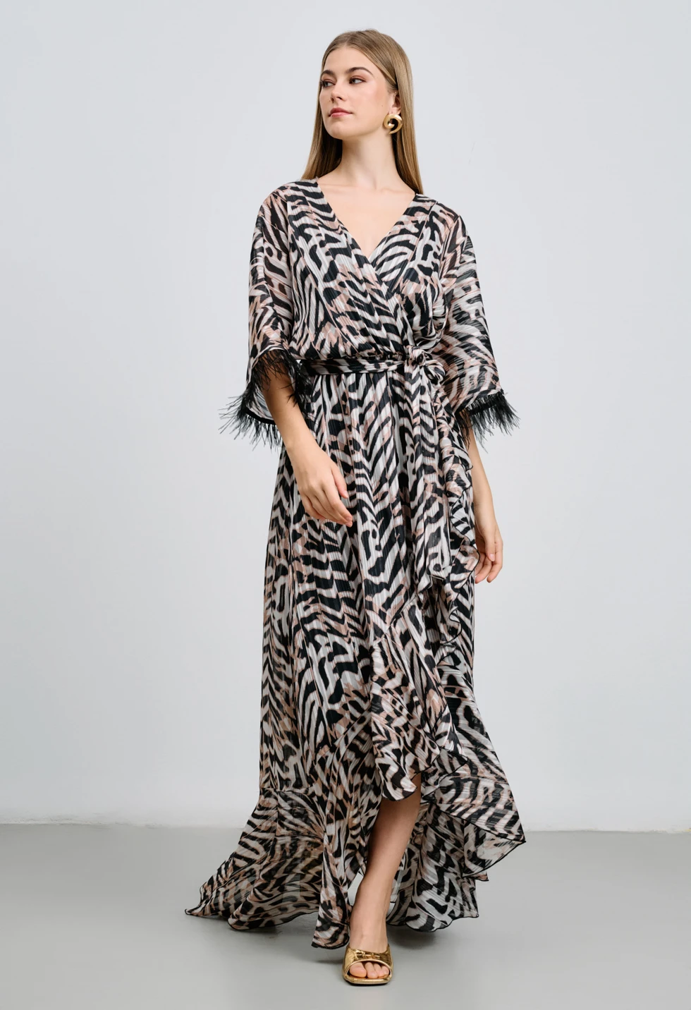 Μακρύ φόρεμα με σταυρωτό V ντεκολτέ και φαρδιά μανίκια με διακοσμητικά φτερά στο τελείωμα, ελαστική μέση και ασορτί ζώνη, φόδρα εσωτερικά, ασύμμετρο τελείωμα με βολάν, κανονική εφαρμογή.